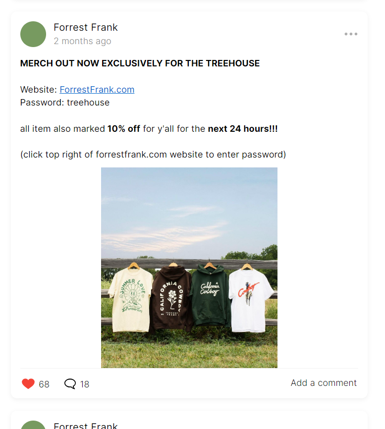 Simple rule: If you are going to charge money for something (such as merch), give first access to ALL members (free included) – you don’t lose any money but the free fans feel special by getting first dibs. This works especially well for a merch drop or tickets to a show/tour. If you aren’t going to charge money for the thing you are promoting (such as a song or video), give a snippet to free members but only give it to paid members. This works especially well for singles/albums/music videos!