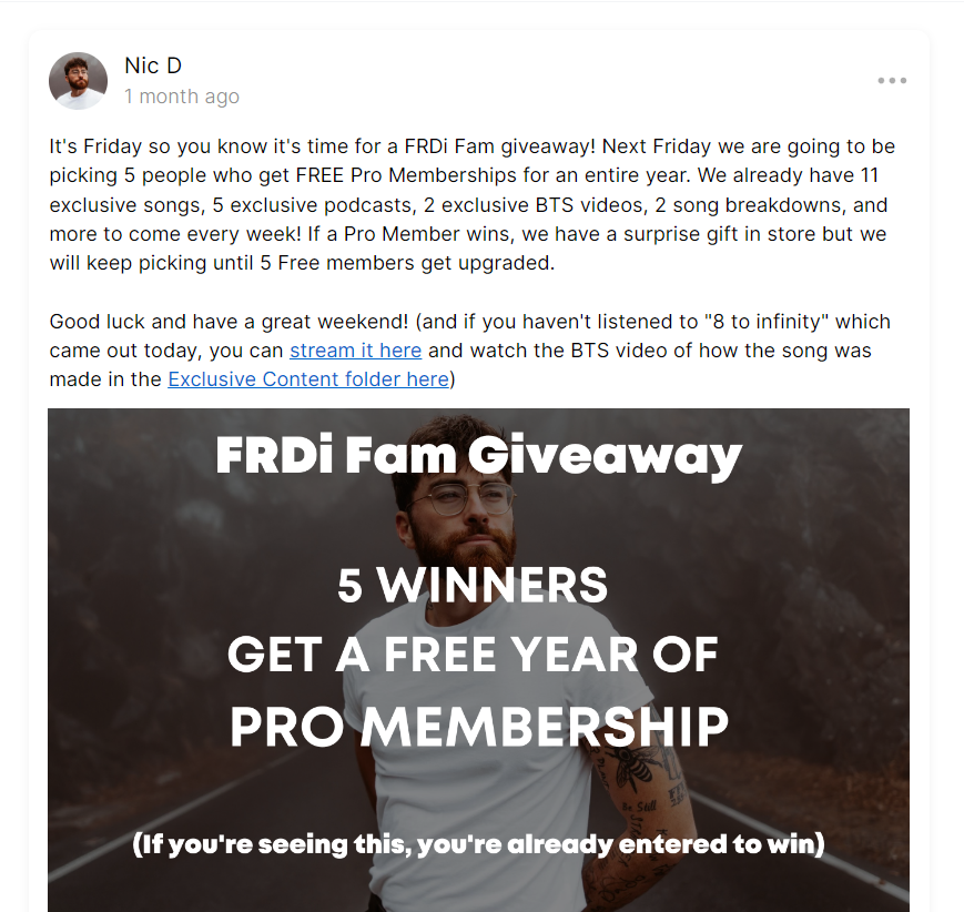 For bigger artists, we have people giving away stuff every week. Mike. gives back $1,000/week to his community! Nic D does a giveaway every Friday! Other artists do a giveaway once a month!