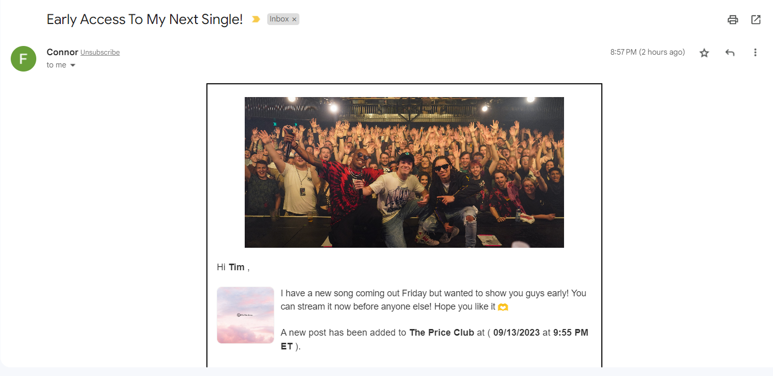 4. The email will show up in a fans inbox with your name as the sender, your header image at the top, and a thumbnail of the media you are sharing.