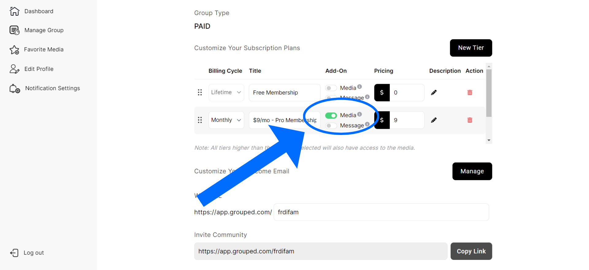 2. Scroll down to the tiers and toggle “Media” so it’s green (this will allow that tier to have access to locked media folders)