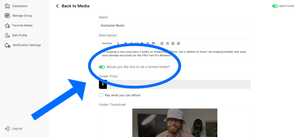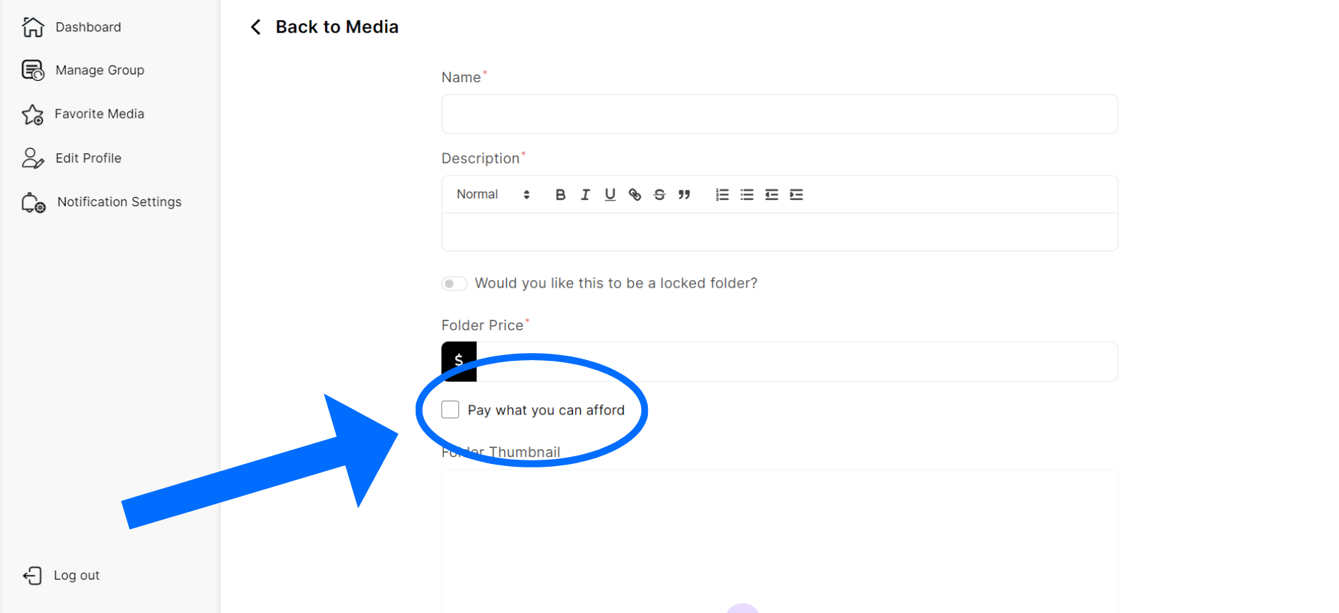2(b) One Time Purchase – this means ALL members (free or paid) have to pay a price that you set to access the folder. This is great to sell digital products like 1-1 zoom calls, cameo-style videos, and more! Just leave the locked folder grey, check the box next to “Pay what you can afford” and put the minimum price in the Folder Price that someone can pay to have access (must be at least $3).
