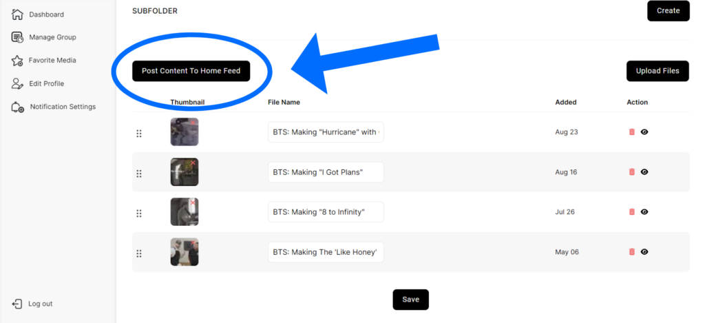 If you added something to a media folder and want to notify your fans, you can click “Post Content To Home Feed” without having to upload again in a new post and it will show up on the home feed with the option to customize an email!