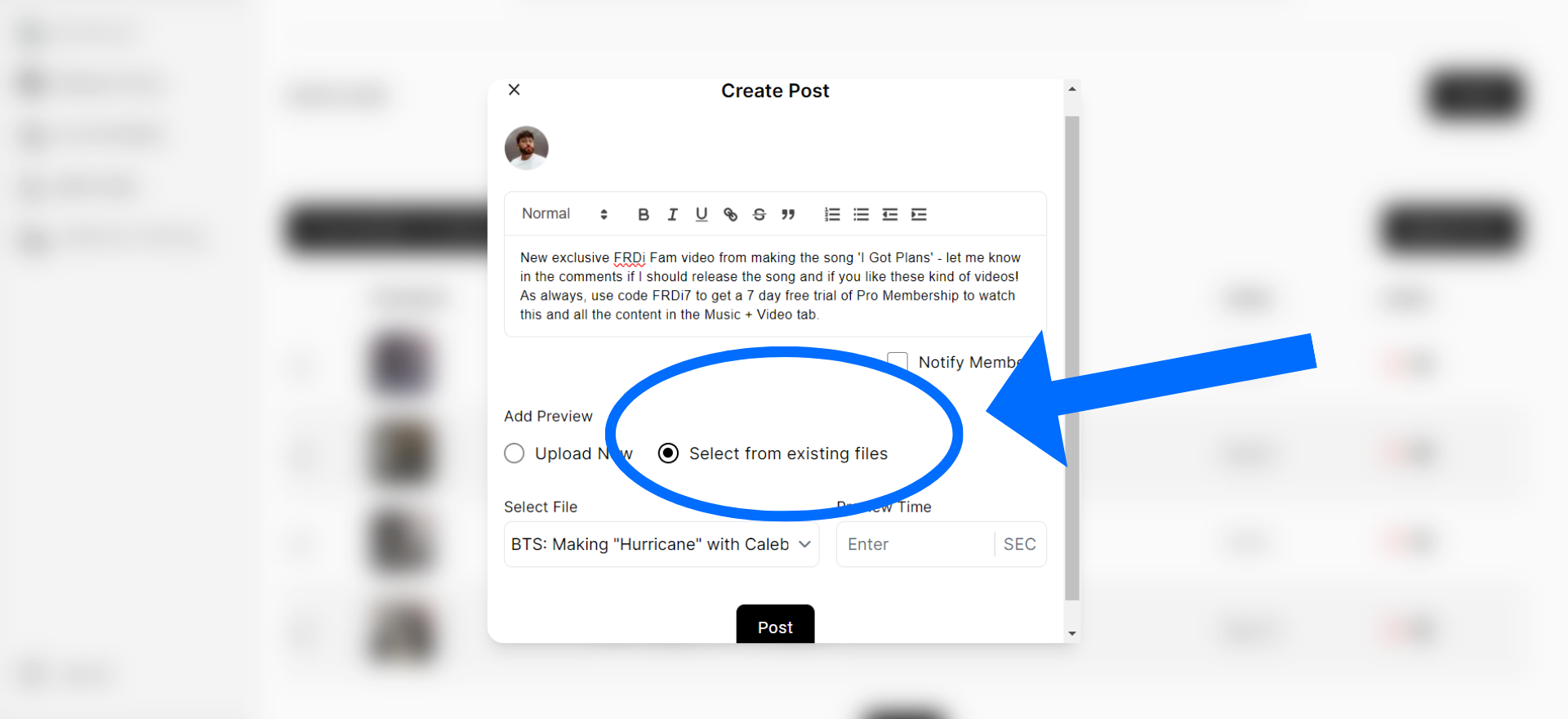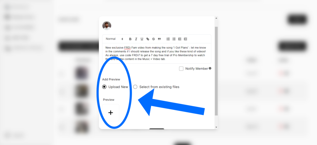 2(a). Type the text you want for the post. If it is a locked/paid folder, you can give a preview to free members. You can choose to upload a custom media file as the preview (you have to if it is an audio file/folder).