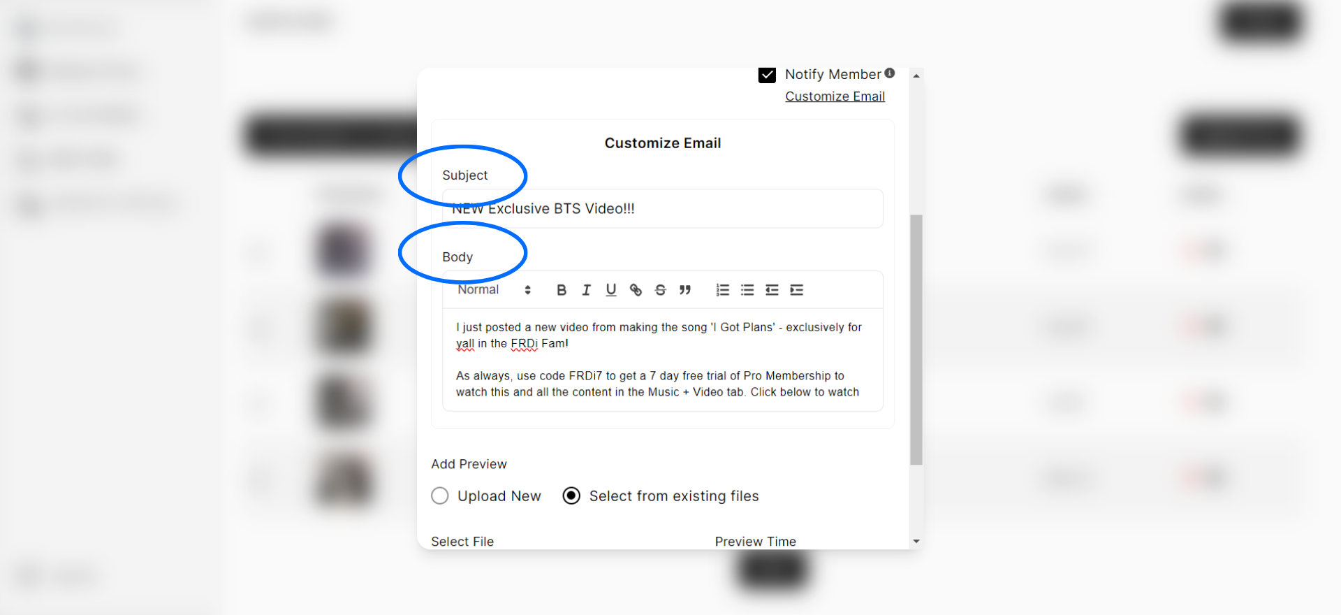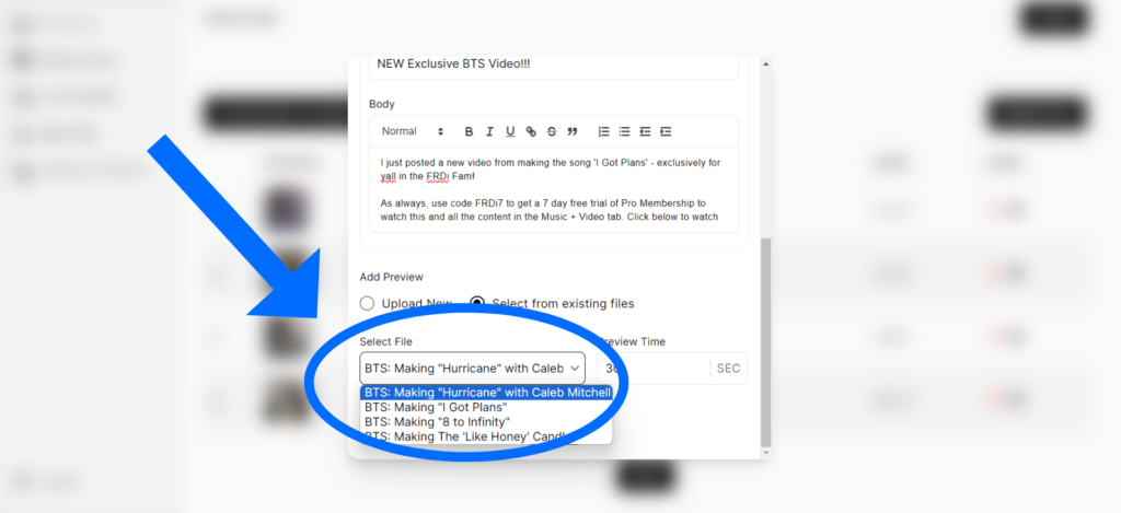 2(b). You can choose to preview one of the files in the media folder by choosing “Select from existing files”. Then choose the file. And how many seconds you want free members to preview (starts at 0 seconds and goes up to 60 seconds).